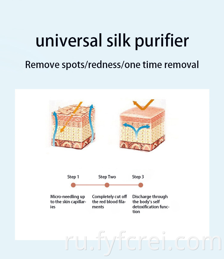 Использование микроточечной высокочастотной вспышки 300 МГц сверхвысокочастотных электромагнитных колебаний с уникальным мягким шелком (тоньше волоса), разрушением гемоглобина за 1/1000 секунды, высвобождает проводимость энергии к поверхности кожи, удаляет больные капилляры и гемоглобин кровеносных сосудов, разбитый на небольшие молекулы, поглощаемые самой тканью кожи, чтобы добиться единовременного постоянного уничтожения красной крови.